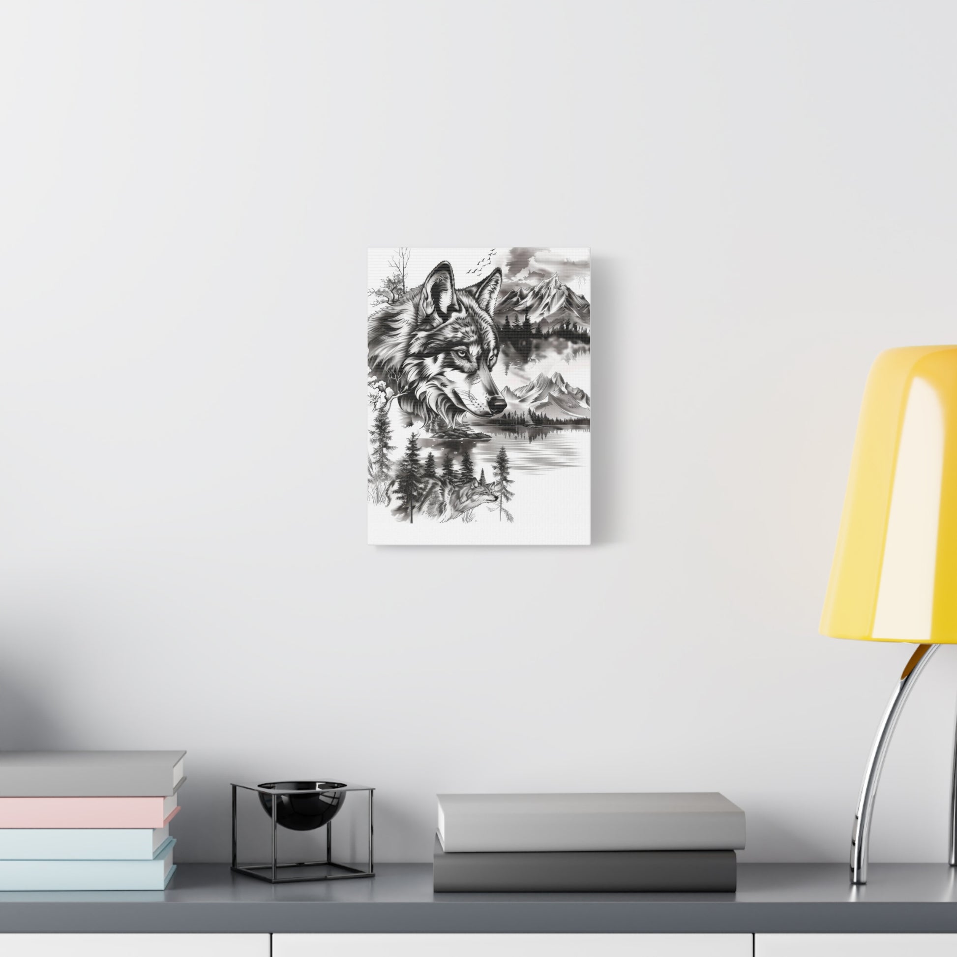 This stretched matte canvas brings a quiet wilderness into your room. Rendered in soft grayscale, the wolf's gaze and layered mountain reflections create a contemplative mood—like a breath of forest air after a long day. Hung above a reading nook or leaned against a mantel, it anchors spaces that favor calm, nature-driven design and storytelling. The subtle texture of the cotton–poly canvas and the radial pine frame add warmth without stealing focus, so the artwork remains the center of attention.