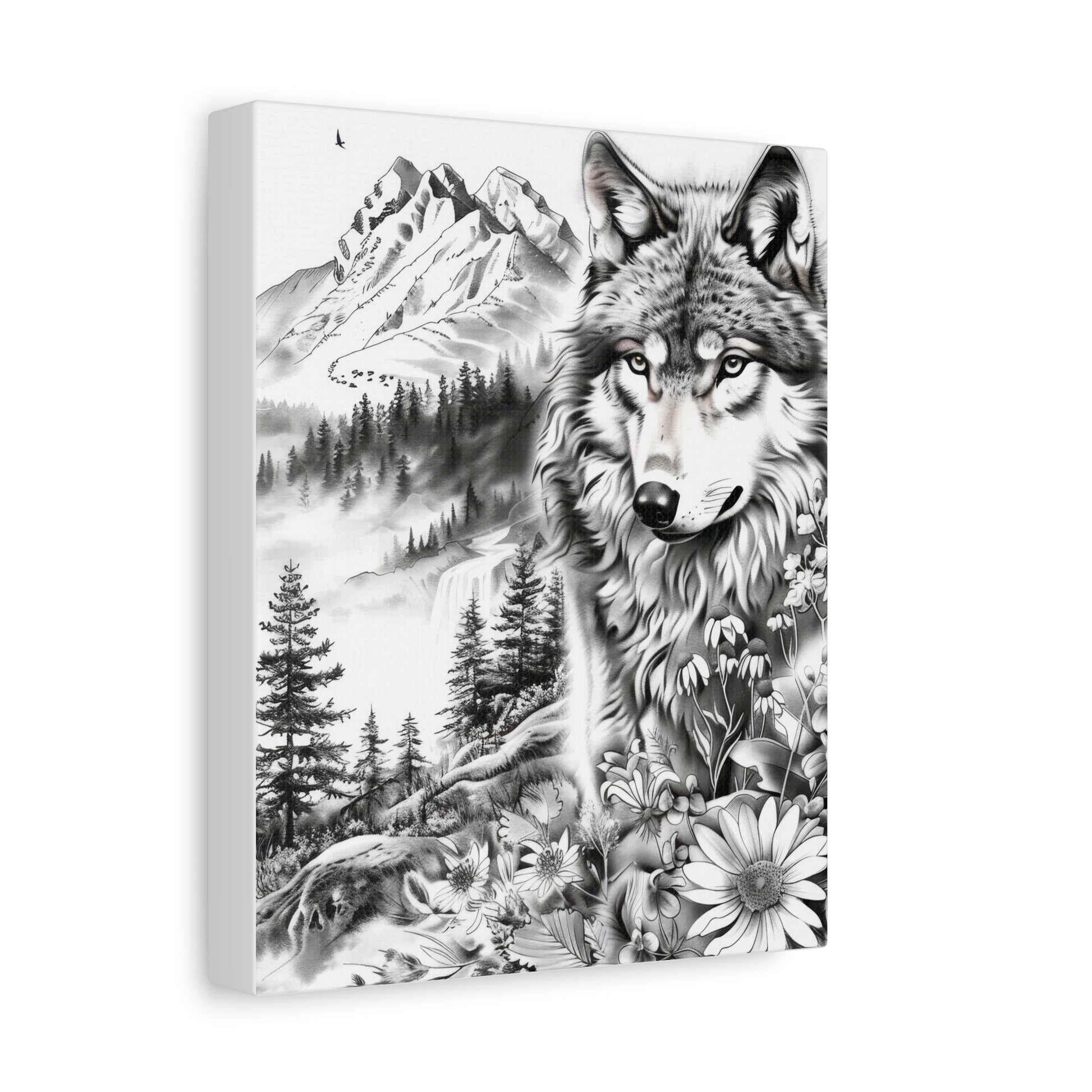 Wolf Mountain Canvas Wall Art — Black & White Nature Print, Floral Wilderness Stretched Canvas