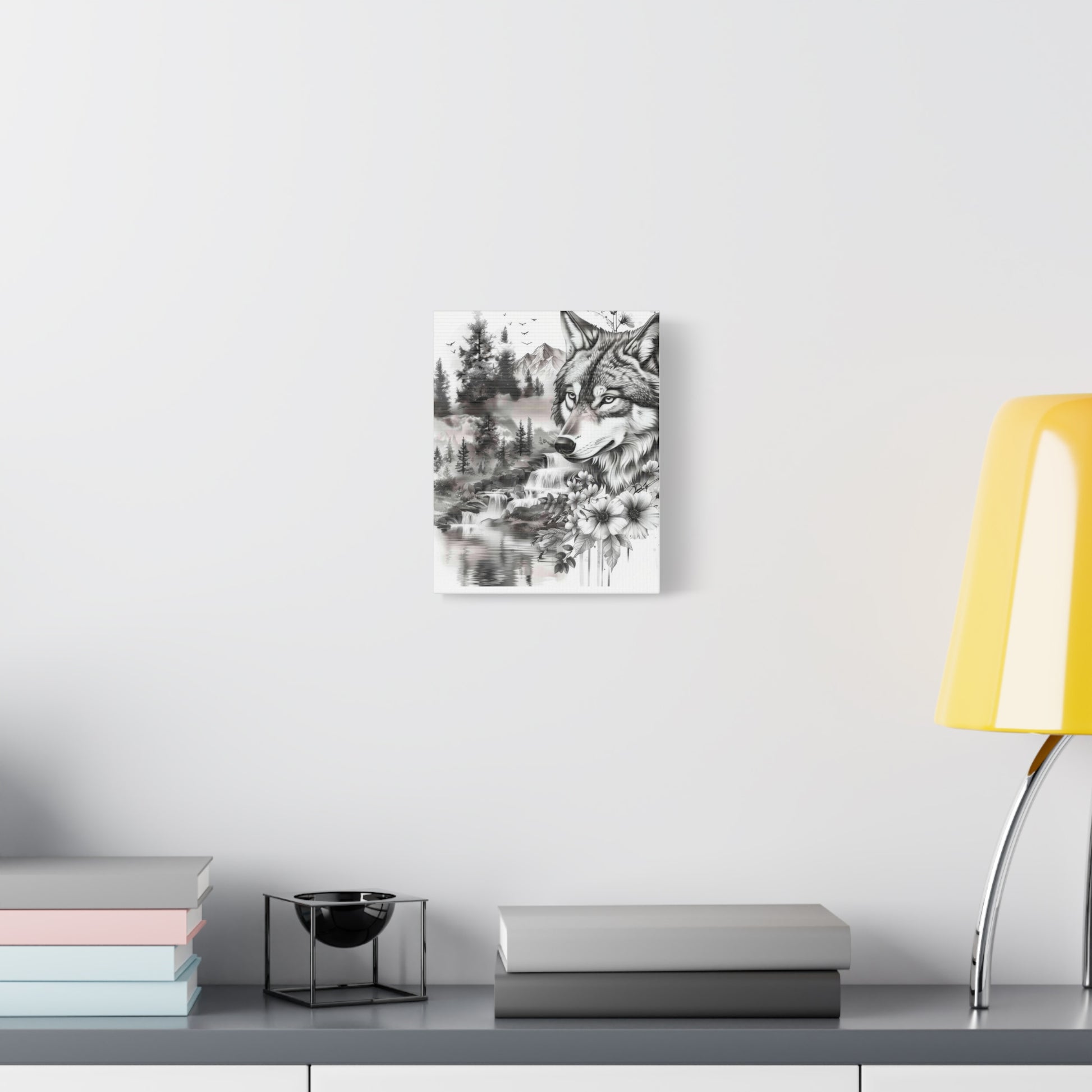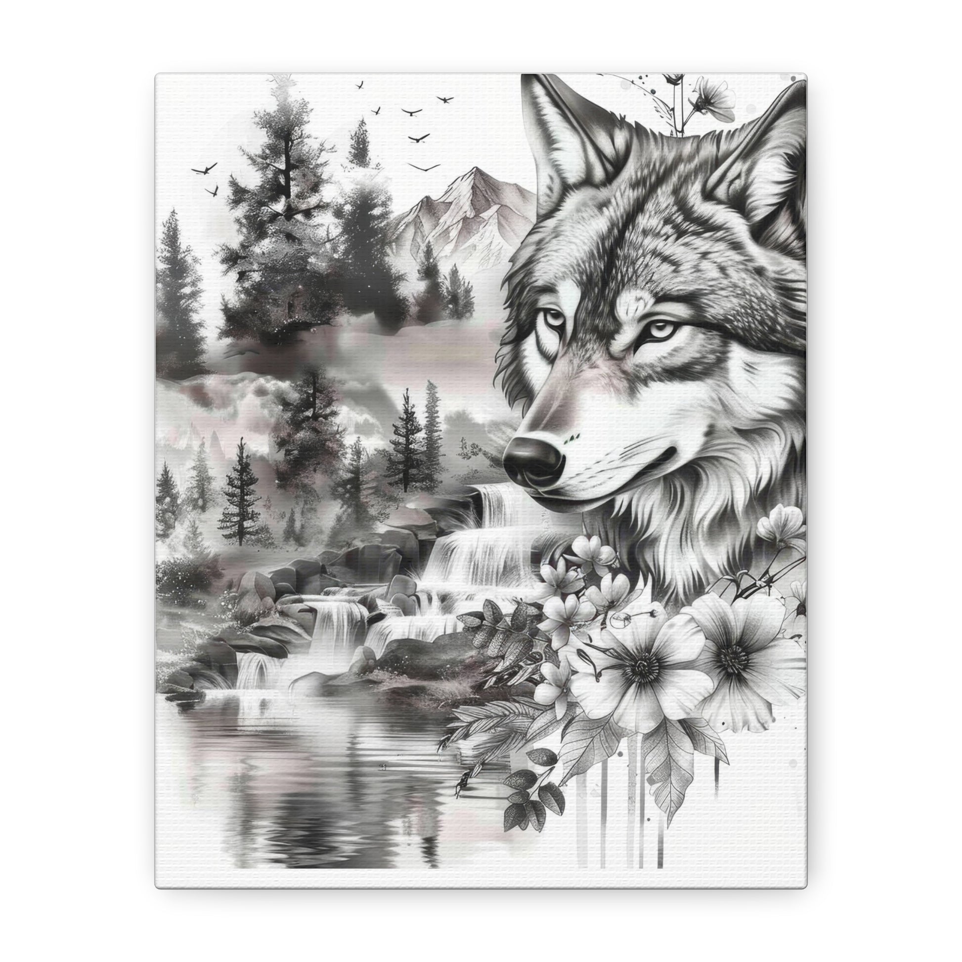 A matte stretched canvas that brings a quiet wilderness into your home. Soft grayscale tones form a layered scene: a watchful wolf, flowing stream, distant pines and mountains, and delicate wildflowers blending into mist. The image reads like a memory — calm, observant, slightly wild — and sits flush on a 1.25" gallery-style profile that feels grounded on the wall.